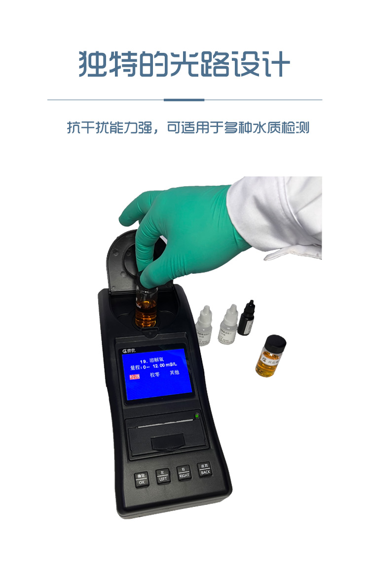 3、溶解氧測試儀采用分光光度的光電比色原理,操作簡便,取水樣放入試劑反應幾分鐘即可讀數,重復性≤±2%。